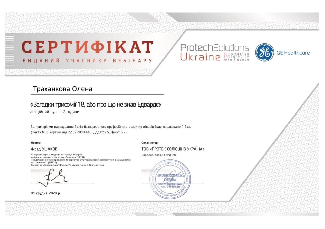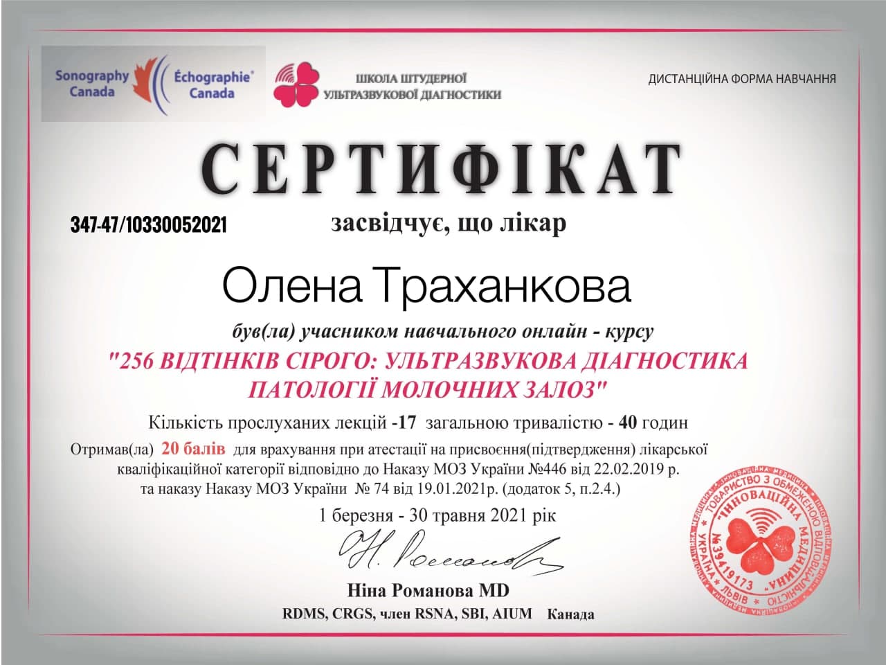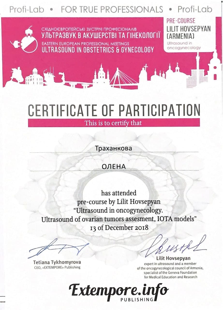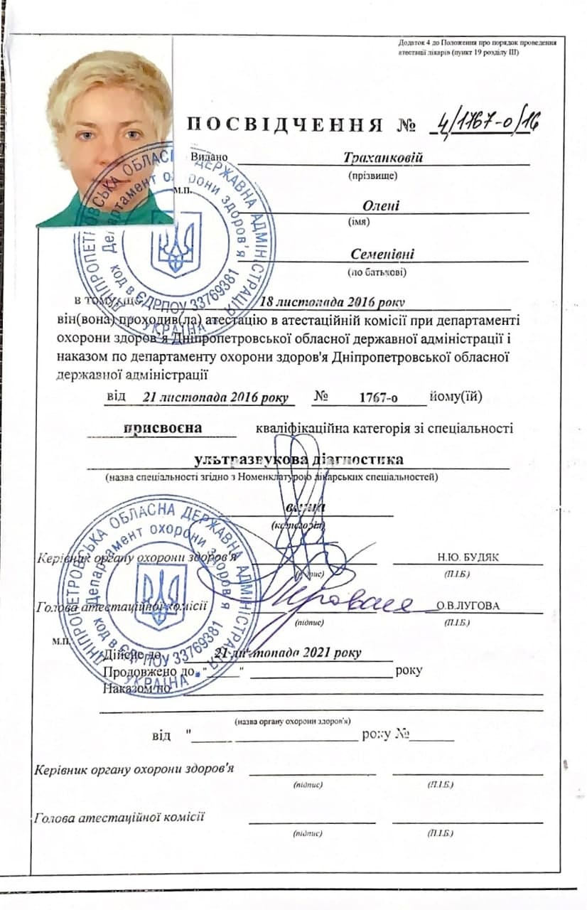 Елена Траханкова — ежедневно и непрерывно участвует в обучающих проектах. Посещает образовательные и научные мероприятий в Украине, Европе и США. Это позволяет внедрять последние научные достижения в повседневную практику для оказания качественной медицинской услуги.