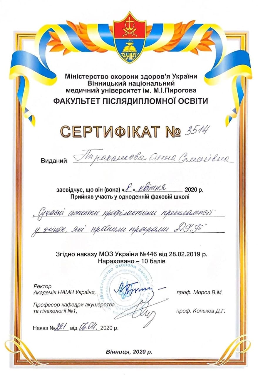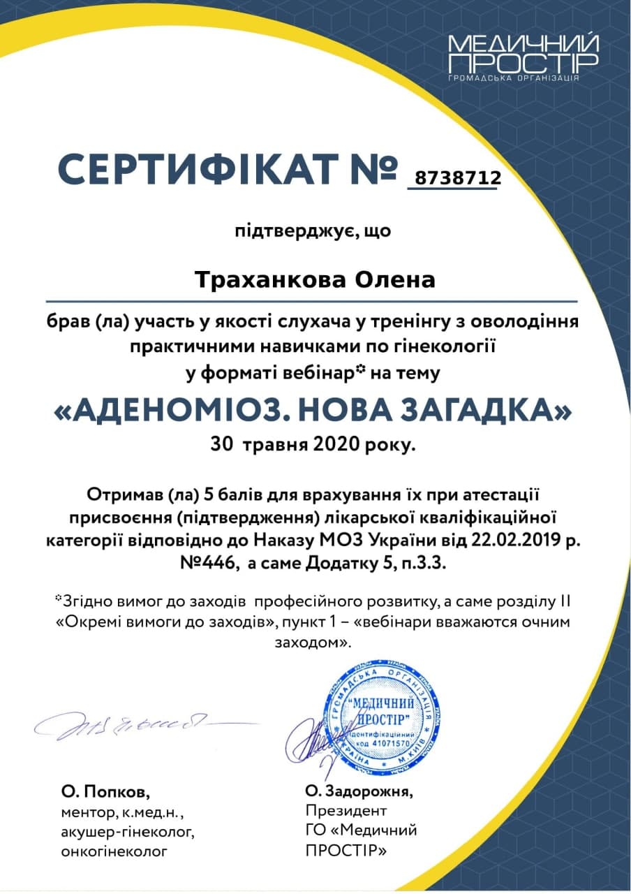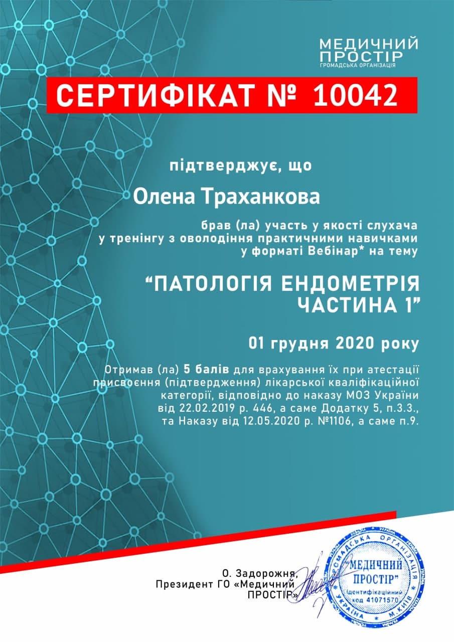 Елена Траханкова — ежедневно и непрерывно участвует в обучающих проектах. Посещает образовательные и научные мероприятий в Украине, Европе и США. Это позволяет внедрять последние научные достижения в повседневную практику для оказания качественной медицинской услуги.