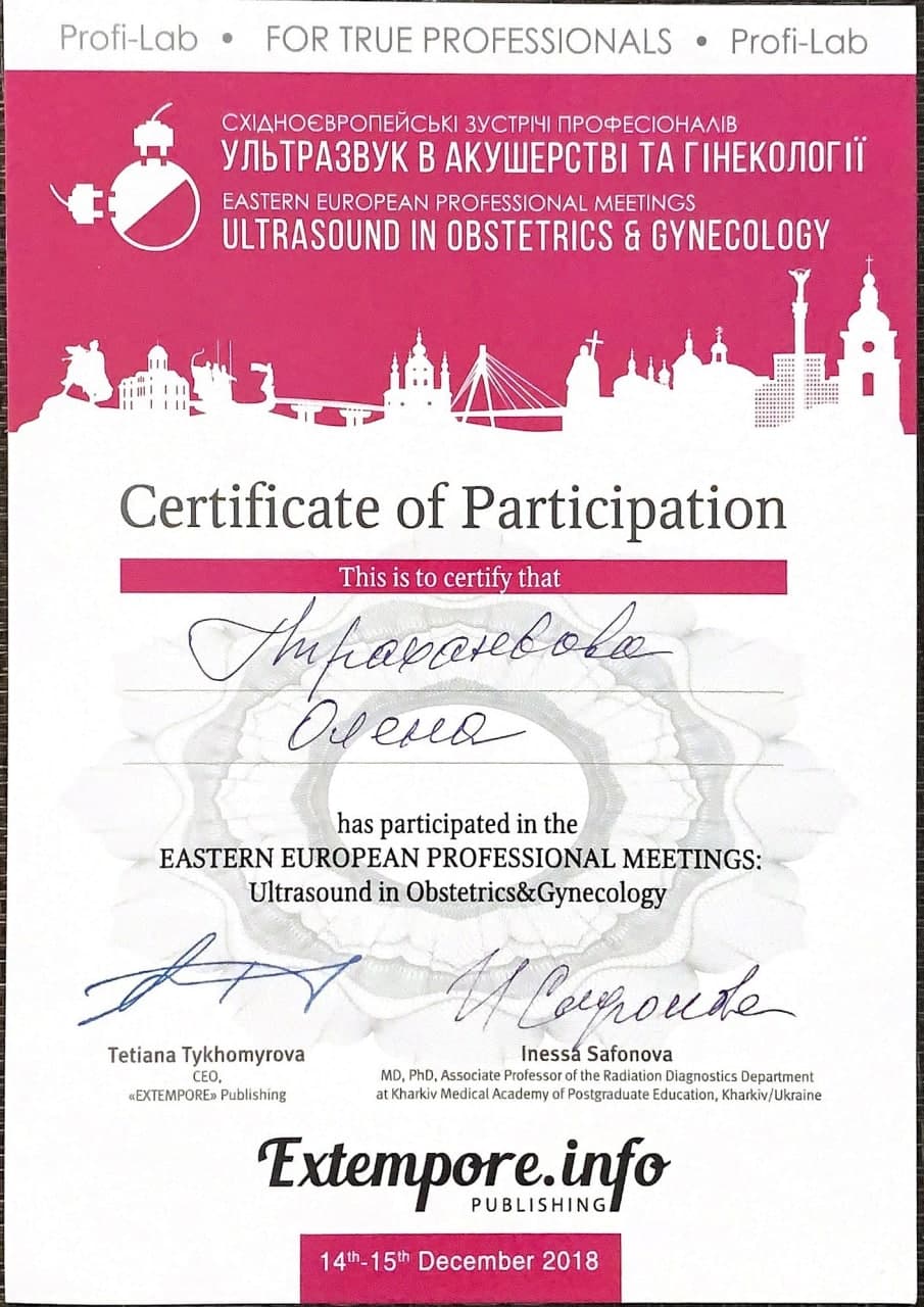 Участник всемирных конгрессов ISUOG и FMF, Eastern European Professional Meeting Ultrasound in Obstetrics Gynecology.